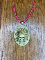 Resin charm Medusa with skull face, comes with a 12in pink cord.